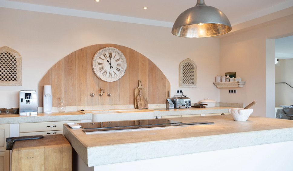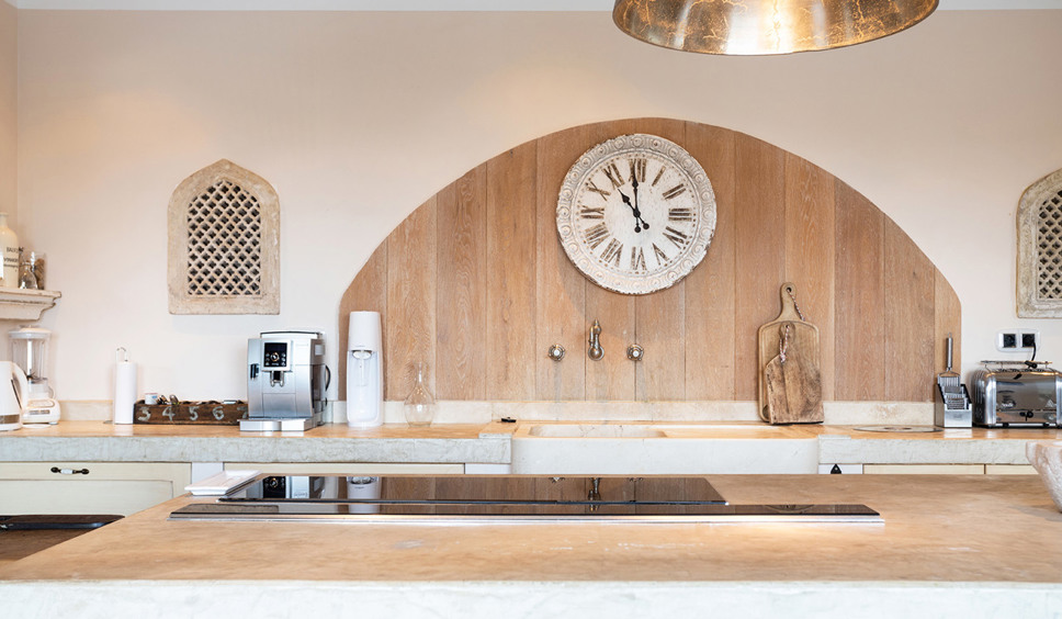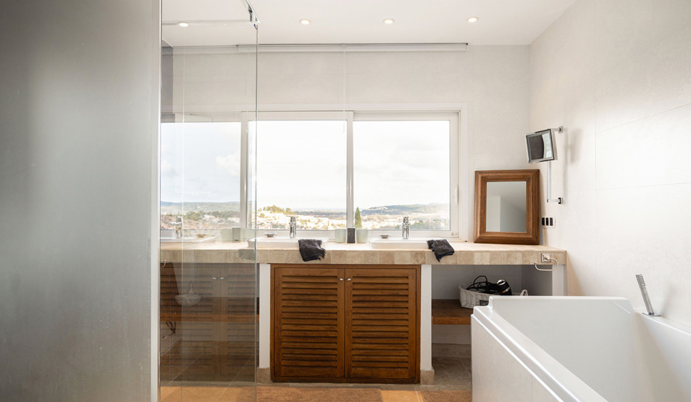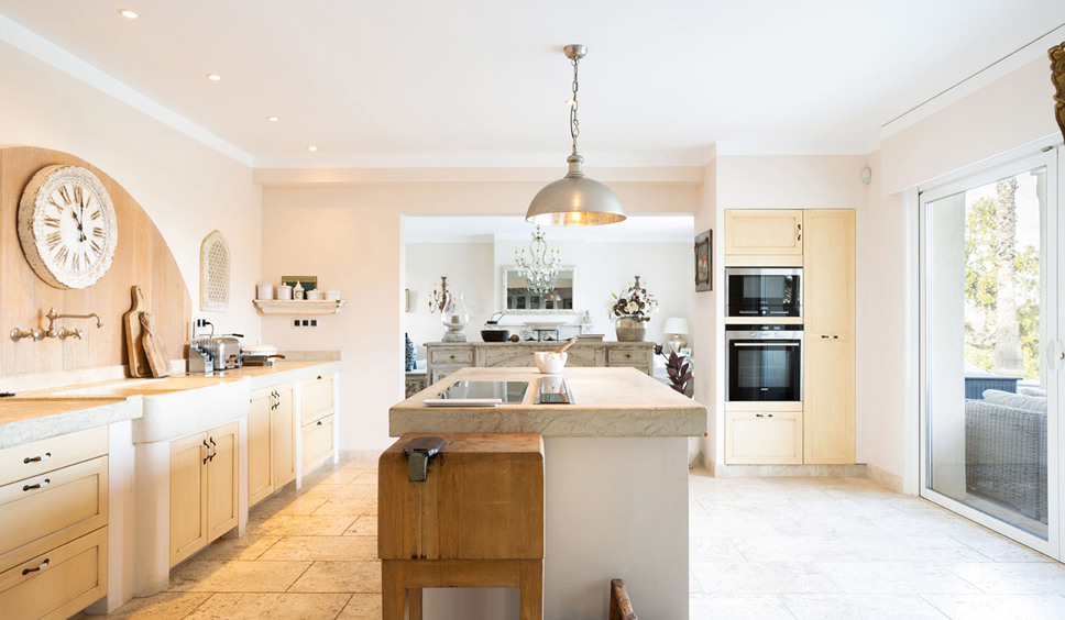 Er is een ruime living met over de gehele zijde een uitzicht over het terras en het zwembad richting de Middellandse Zee. De living beschikt u over een royale zithoek en een ruime woonkeuken met eetgedeelte. Zowel de living als de keuken bieden toegang via de grote schuifdeuren tot het overdekte gedeelte van het terras. De keuken zelf beschikt over alle voorzieningen, 4 kookplaten, magnetron, oven/grill, koelvrieskast, afwasmachine, broodrooster, waterkoker en koffiezetapparaat.