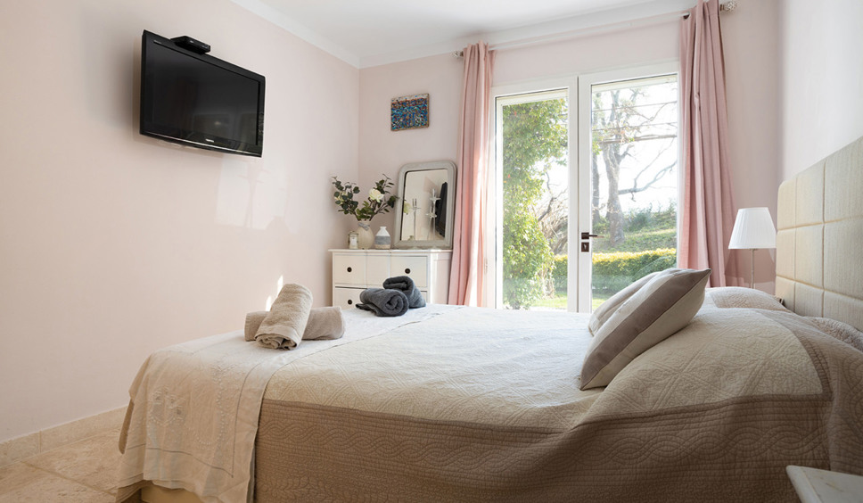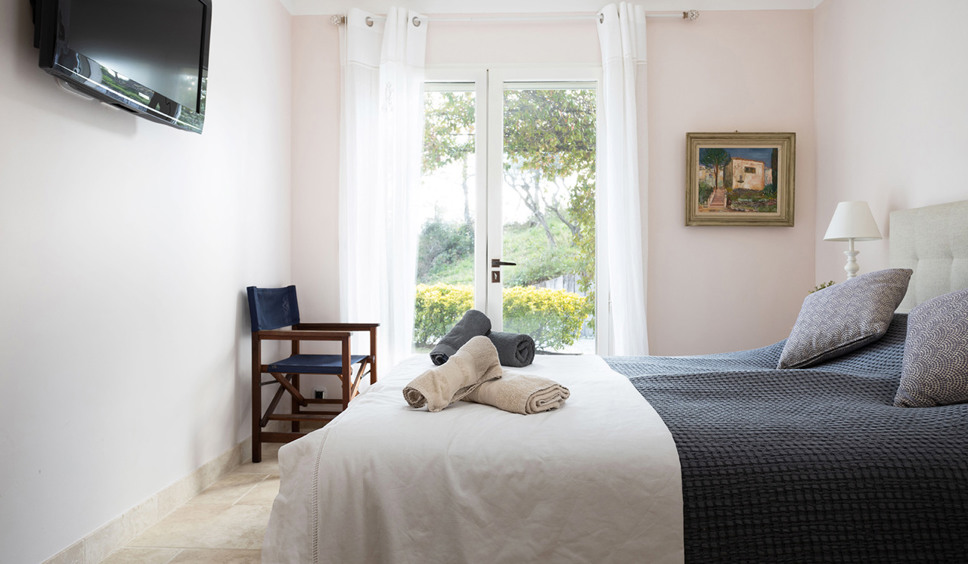 Begane grond, op de slaapkamers 3 en 4 op de begane grond staan ook tweepersoonsbedden (158x180). De slaapkamers delen een comfortabele badkamer (douche en W.C). Beiden slaapkamers bieden toegang tot het terras met tuinmeubelen aan de zijkant van de villa.