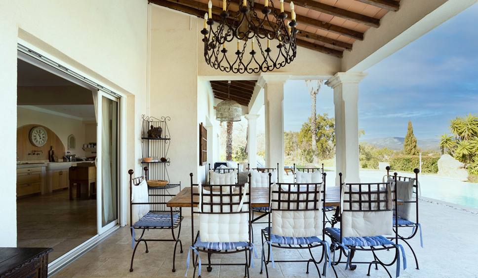 Vanuit de gehele begane grond loopt u zo het terras aan de voorzijde van de villa op. Het terras is gedeeltelijk overdekt en biedt goede schaduw aan het einde van de middag. Er staat een comfy loungeset dus een mooie plek om heerlijk te genieten van een goed boek en een glas koude rosé.