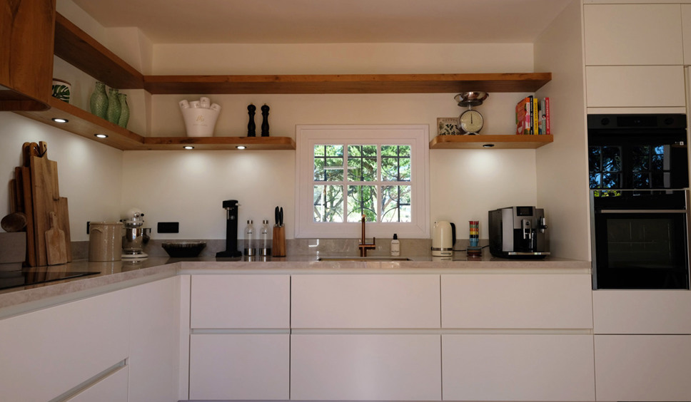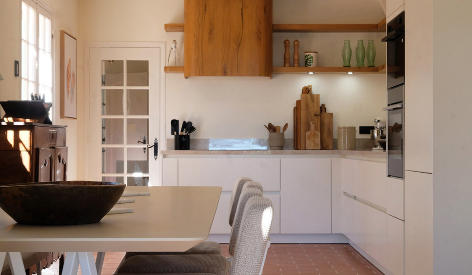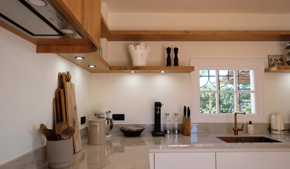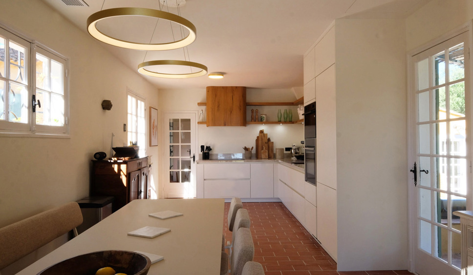 De royale moderne woonkeuken vormt het kloppend hart van de villa. Deze is voorzien van een royale eettafel voor 8 personen. De keuken biedt luxe keukenapparatuur waaronder een Jur a E8 volautomatische koffiemachine. De keuken biedt via toegang tot een overdekt terras met zomerkeuken alsook via openslaande tuindeuren naar de tuin en het zwembad.