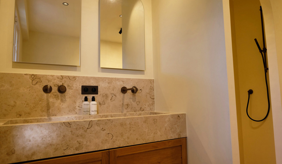 Slaapkamer 3, gelegen op de midden verdieping, biedt een luxe tweepersoonsbed (160x200) en een en-suite badkamer met inloopdouche en wastafel.