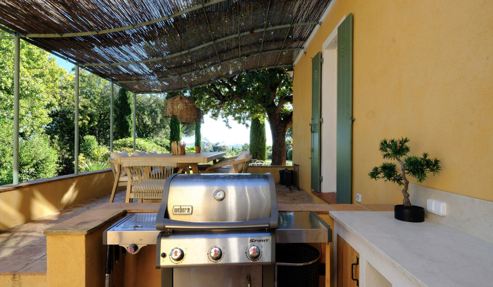 Rondom de villa, in de schaduw, vindt u verschillende zitgelegenheden. In de tuin direct aan de living staat een grote eettafel. Ook staat er één onder de pergola op het terras naast de keuken. Hier staat ook de BBQ.