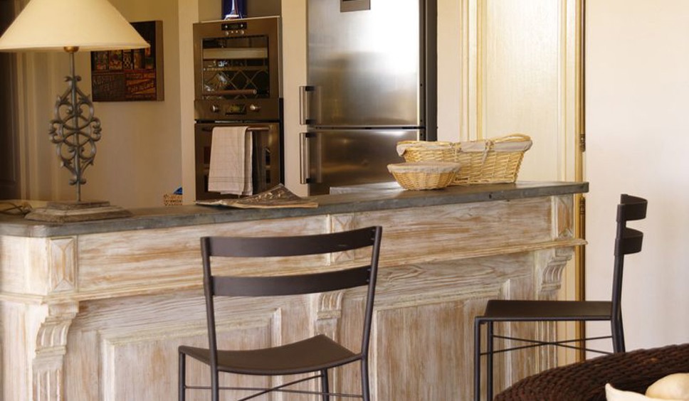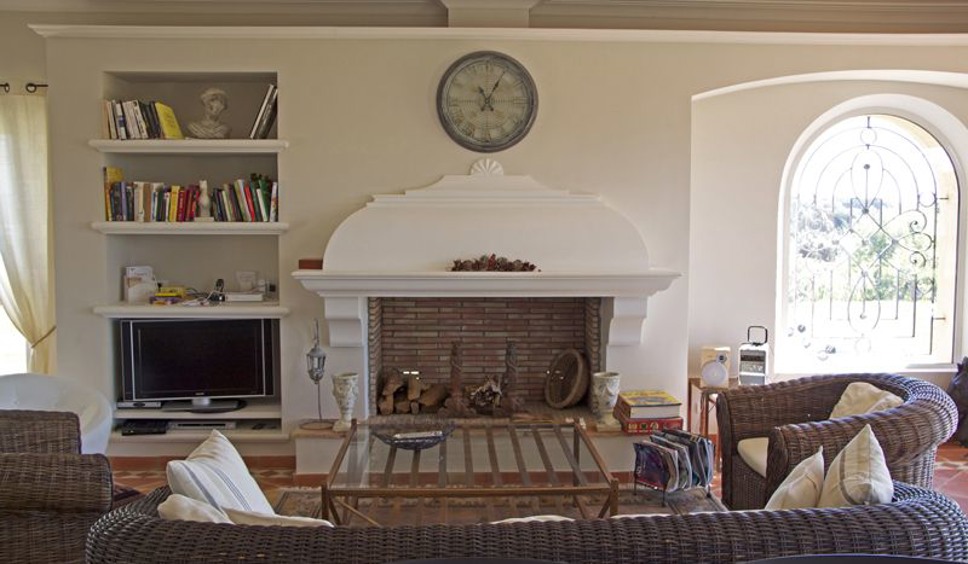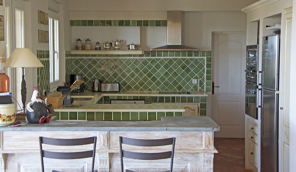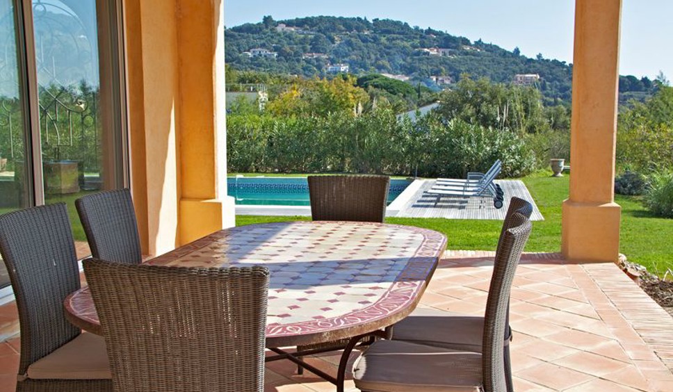 De living is ruim en licht. De villa is sfeervol ingericht met een combinatie van rotan, Provençaalse tegels, teakhout en frisse witte muren. Grote glazen schuifdeuren geven toegang tot het overdekte terras met prachtig uitzicht richting Saint-Tropez en de Middellandse Zee. De open keuken is uitgerust met diverse elektrische apparaten. Er is WiFi aanwezig.