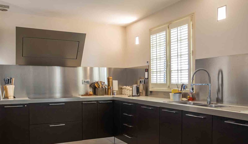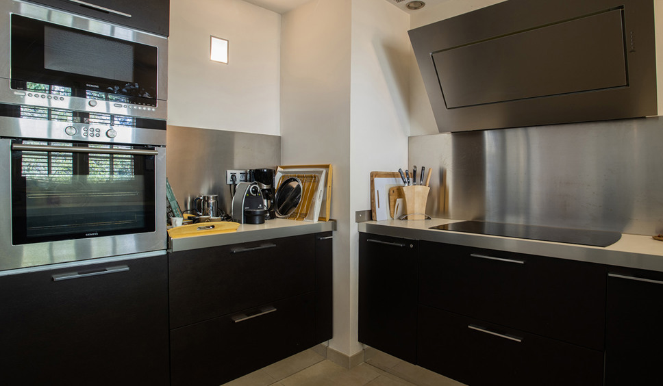 Aan de andere zijde van de living bevindt zich een bibliotheekruimte met boeken en comfortabele zitplaatsen. Centraal in het living staat een grote boerderij XL-tafel voor 14 personen. De moderne open keuken is van een Italiaanse ontwerper en is uitgerust met moderne Siemens apparatuur, een Nespresso-apparaat en een Miele elektrische kookplaat.