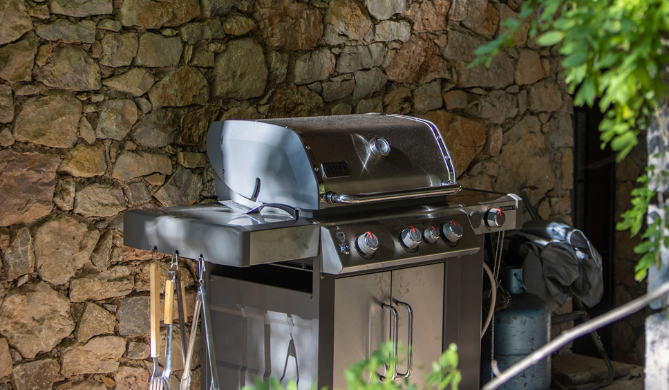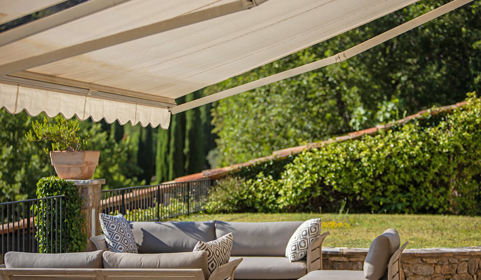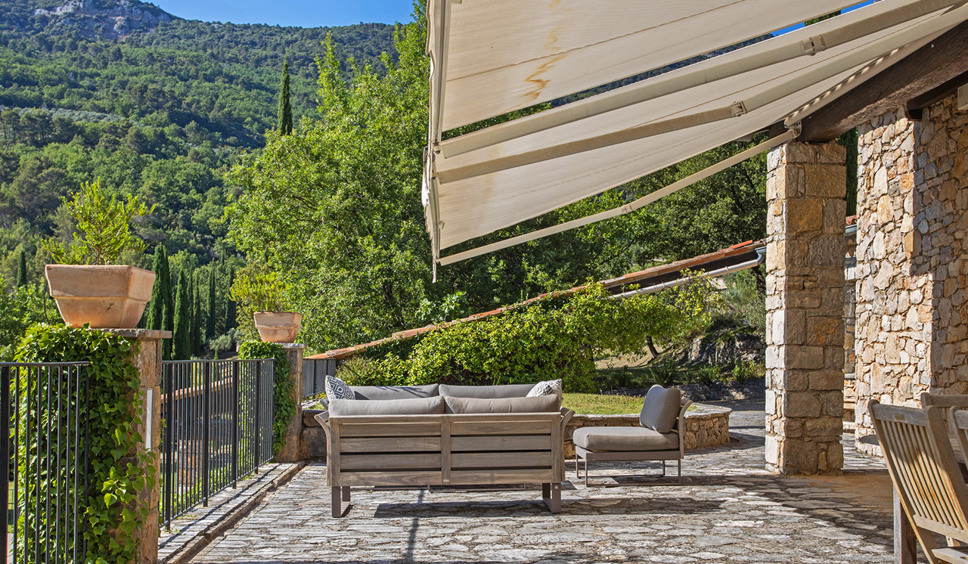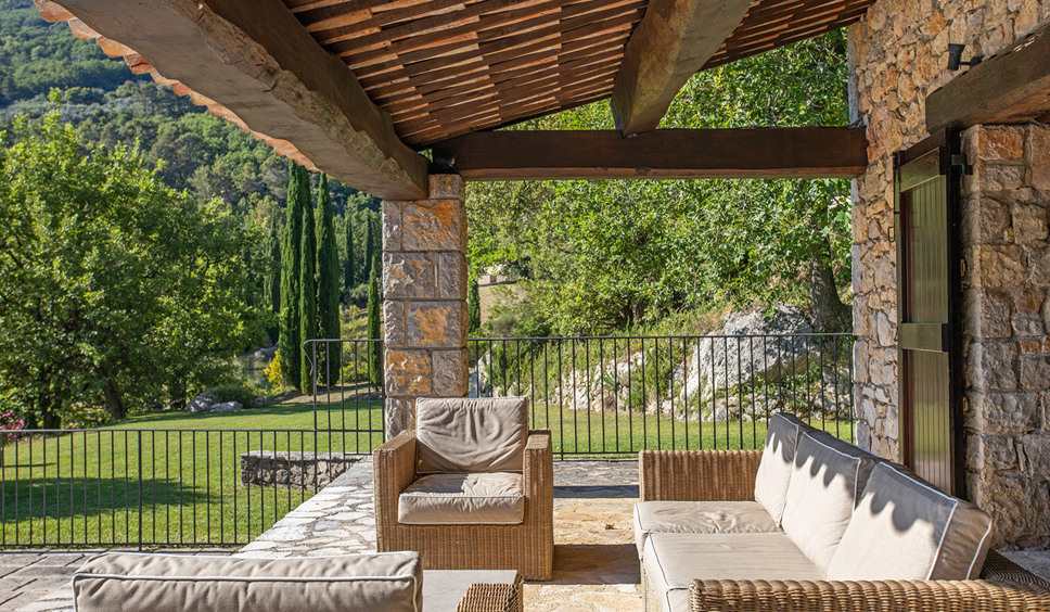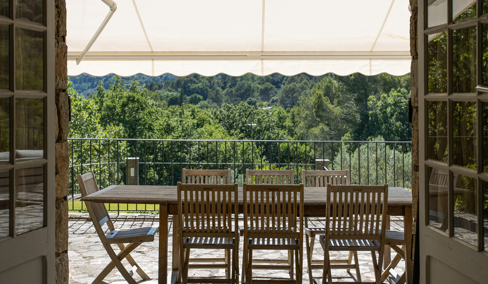 Vanaf de gehele begane grond heeft u een breed uitzicht over de vallei en het dorp Bargemon. Via openslaande terrasdeuren loopt u vanuit de living naar het grote stenen terras waarop een houten eettafel staat en een Weber gasbarbecue. Ook vanaf het terras kunt u genieten van een prachtig uitzicht.