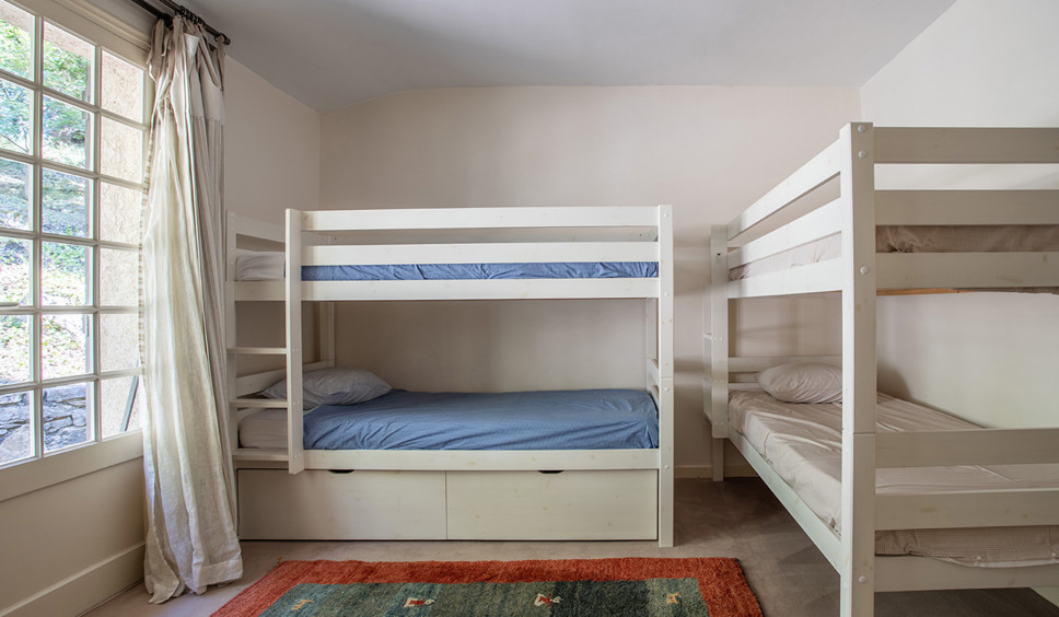Slaapkamer 3 en 4 liggen naast elkaar. Op slaapkamer 3 staat een tweepersoonsbed (160x200). Slaapkamer 4 is de kamer voor de kinderen. Er staan 2 witte stapelbedden. De slaapkamer 3 en 4 delen een badkamer (bad en douche in bad).