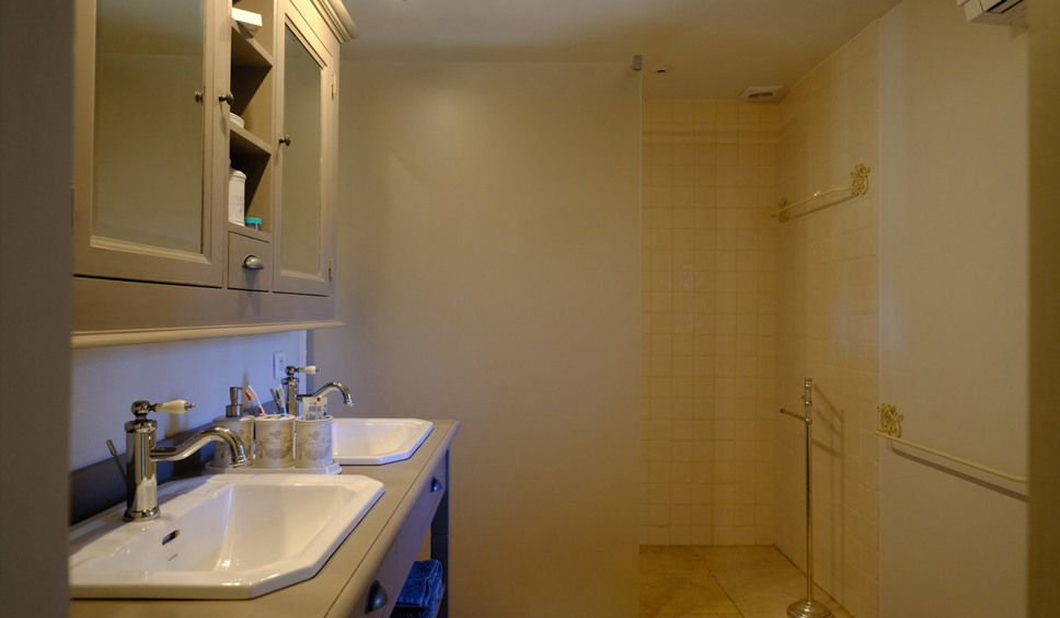 Gezamenlijke badkamer op de gang met dubbele wastafel en inloopdouche. Er is een separaat toilet.