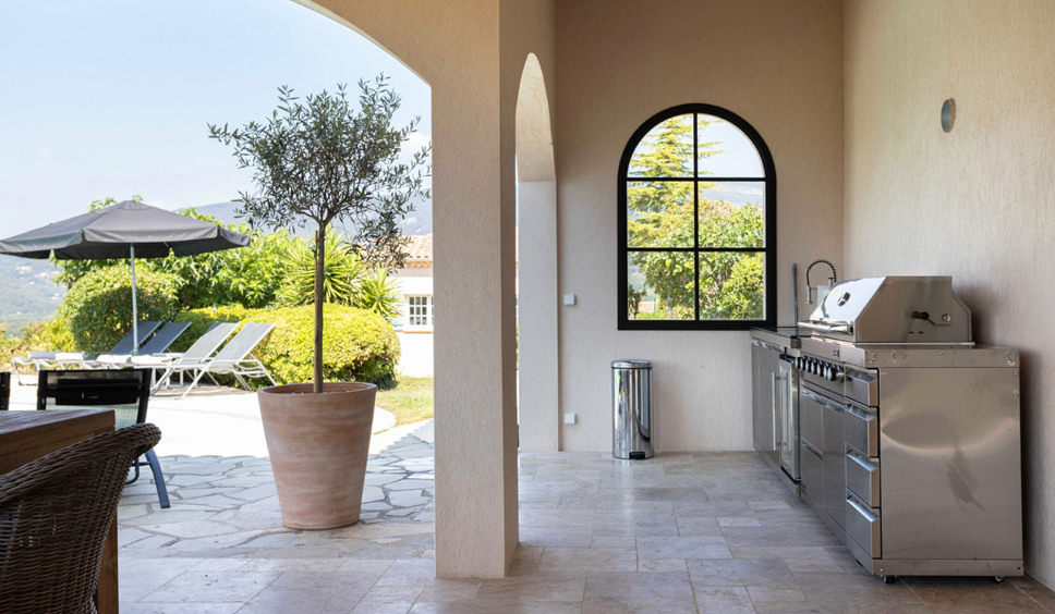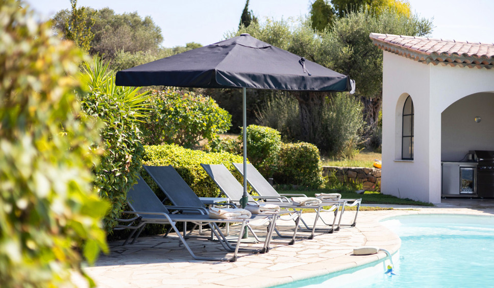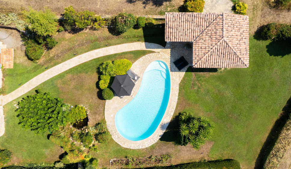 Het zwembad is niervormig en meet ongeveer 11 x 4 m. Erg leuk is het poolhouse met zomerkeuken (oa BBQ) en eettafel. Er zijn ligstoelen en parasols aanwezig. Vanaf het terras rondom het zwembad is er fraai en breed zicht op het Provençaalse landschap. Het dorp Fayence is een zogenaamd bergdorpje, hoger gelegen om de hogere zomer temperaturen te ontlopen.
