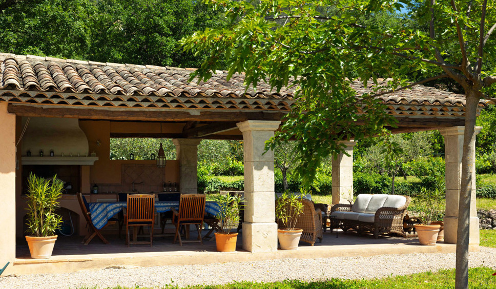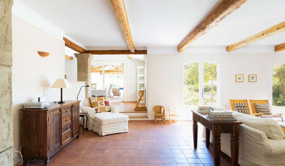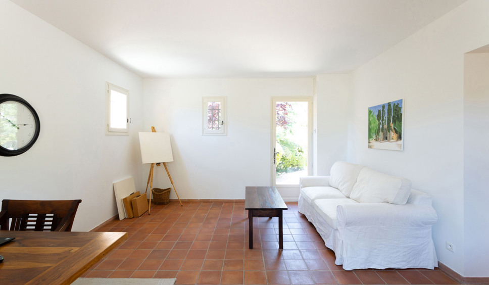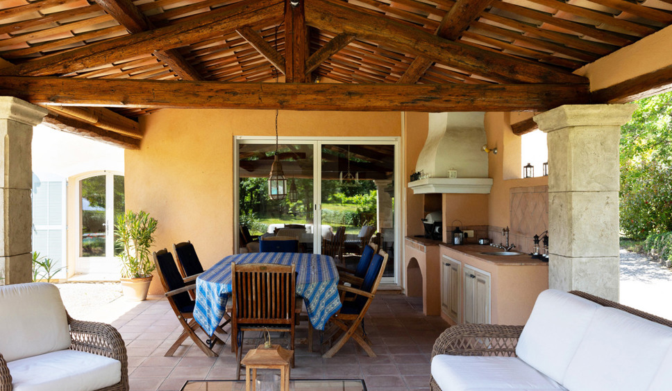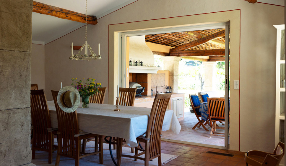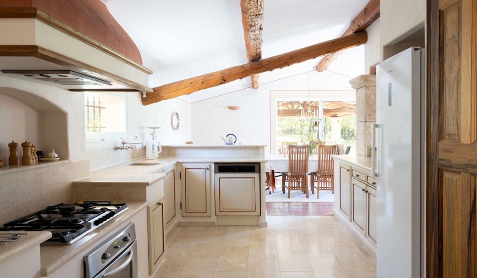 Vanuit de entree komt u binnen in de sfeervol ingerichte living. Een comfortabele zithoek is opgesteld rond de open haard. Vanuit de living loopt u door naar de keuken. De Provençaalse keuken is compleet ingericht. Ook staat hier een grote eettafel opgesteld. Vanuit de keuken bieden twee grote schuifdeuren toegang tot het grote overdekte terras met buitenkeuken, eettafel en een zithoek. De gehele villa is voorzien van airconditioning.