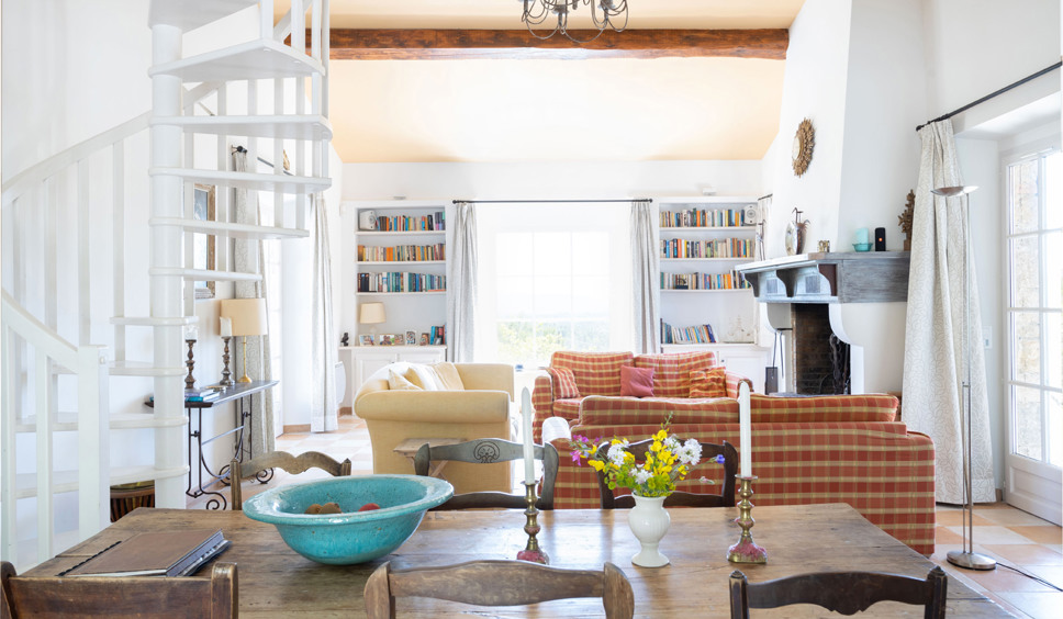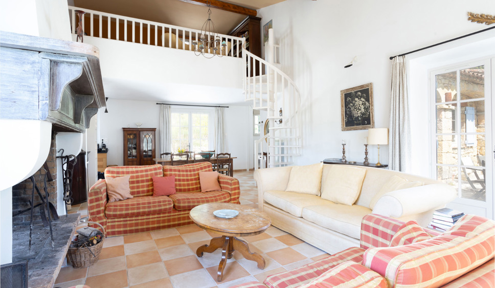 De woning heeft een ruime living met een comfortabele zithoek met open haard. De grote ramen bieden fraai uitzicht over de Provençaalse heuvels. Openslaande deuren geven toegang tot verschillende terrassen.