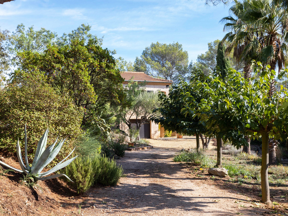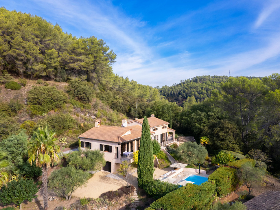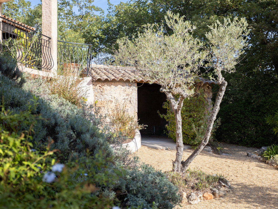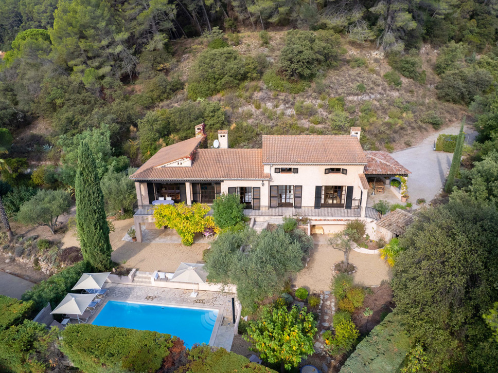 Aan de rustige weg die naar het gehuchtje Le Meyas leidt, ligt de inrit van het terrein van deze villa. Een deel van het terrein (5500 m2 groot) is gras met volgroeide bomen, een deel (achter het huis gelegen) bestaat uit een met struiken begroeide helling. De grote kracht van deze villa is de goede zonligging en het fraaie uitzicht op wijngaarden, heuvels, het dorpje La Motte en bij helder weer ziet u zelfs een streep zee!