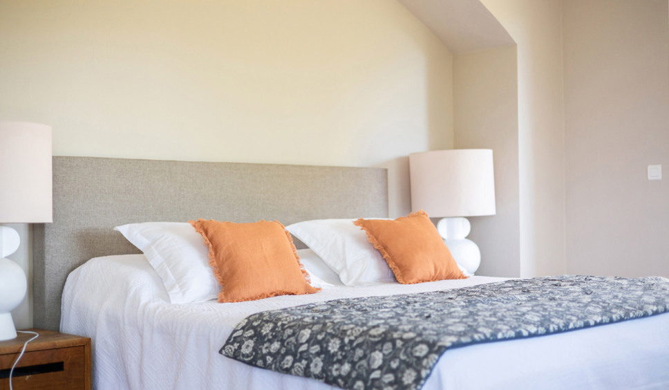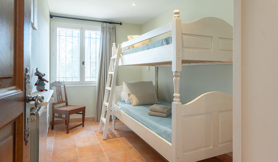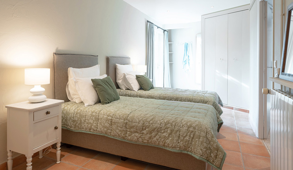 Slaapkamers 5 en 6 bevinden zich een verdieping lager. Vanuit deze slaapkamers is er direct toegang tot het terras op tuinniveau. Makkelijk om direct na het ontwaken een verfrissende duik te nemen in het zwembad. Op slaapkamer 5 staat een tweepersoons bed (2x90x200). Op slaapkamer 6 staat ook een tweepersoonsbed (180x200), de badkamer is en-suite (douche en WC).
