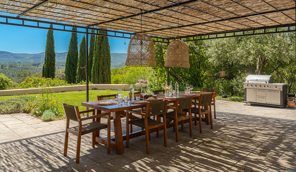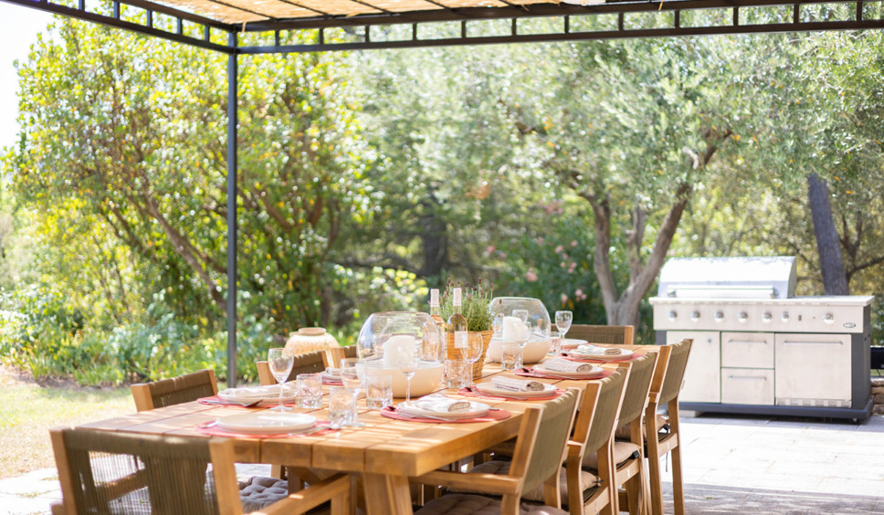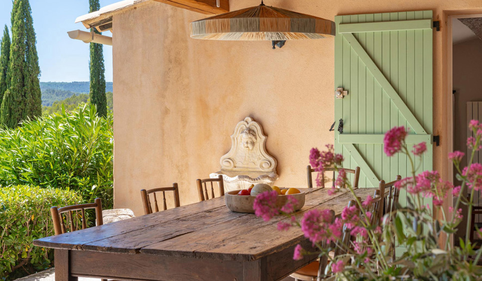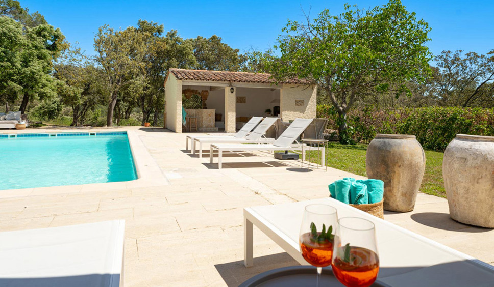 Ook fijn is het poolhouse. Zo is een verkoelend glas rosé of Perrier altijd dichtbij. Mooi detail is de buiten tafel onder de XL vijgenboom bij het poolhouse. Wat ons betreft de plek voor een mooie lunch. Altijd fijn om even af te kunnen koelen van de Zuid-Franse zon.