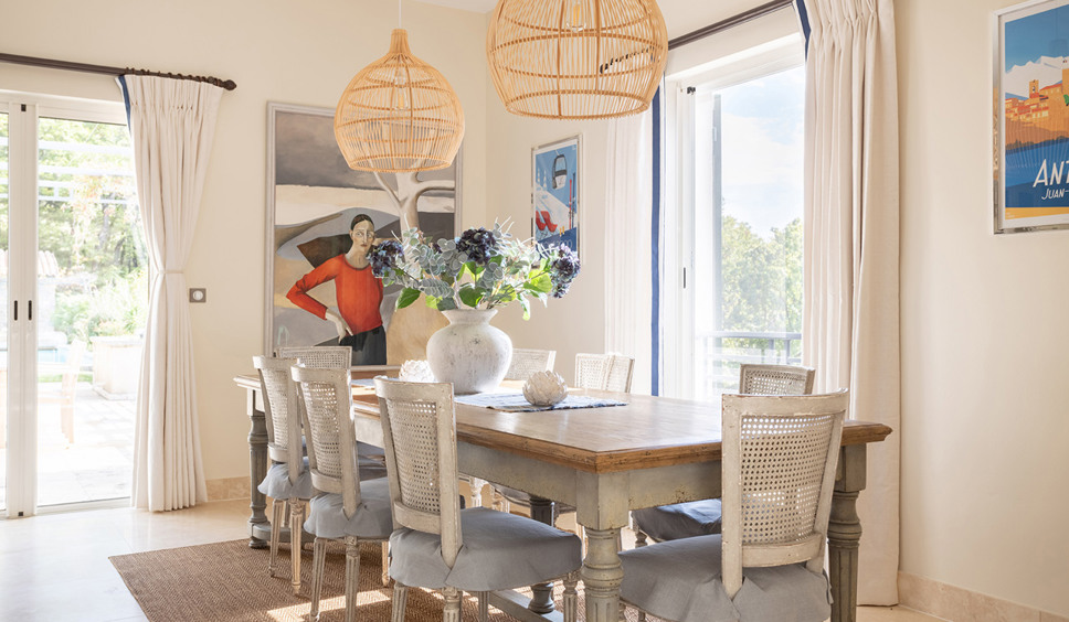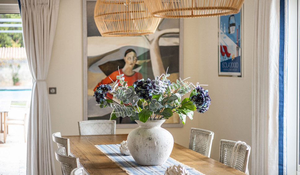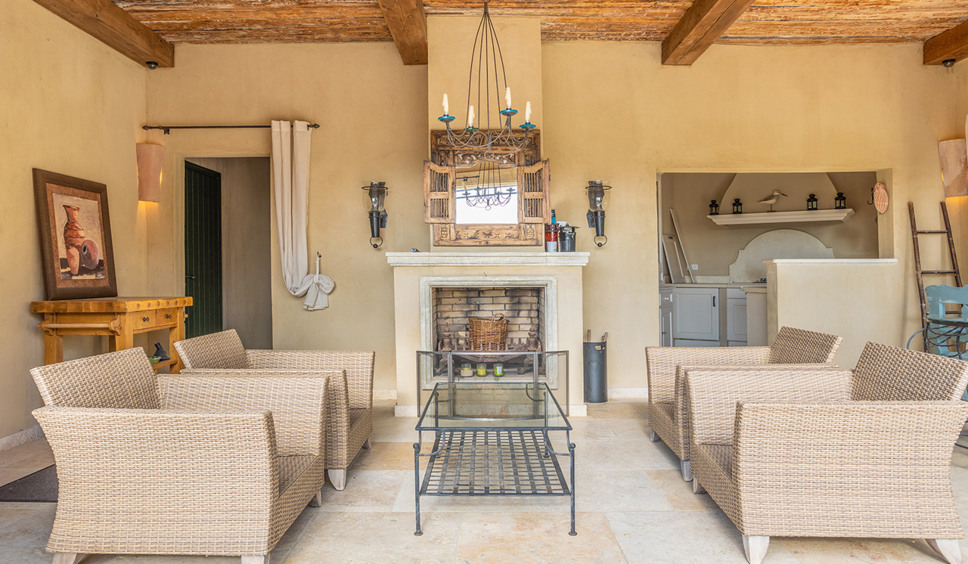 De living is sfeervol en voorzien van modern zitmeubilair met een focus op de open haard, erg leuk om te gebruiken tijdens het voor- en naseizoen. Grote ramen zorgen voor veel licht inval en een prachtig zicht over de Provençaalse campagne. In het verlengde van de living en verbonden met de grote open keuken is de eetkamer met een ruime eettafel met 8 stoelen.