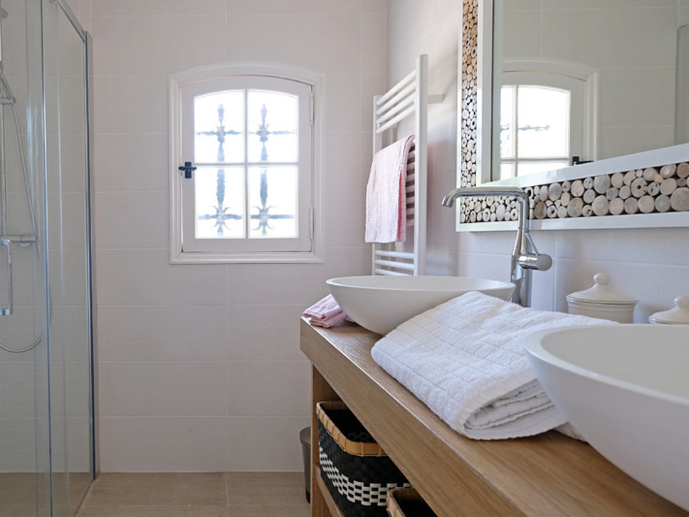 Slaapkamer 4 heeft eveneens een tweepersoonsbed (140x200). Deze slaapkamer heeft openslaande deuren naar de schaduwrijke patio. De 3 slaapkamers beneden delen een badkamer (douche en wastafel) en een separaat toilet.
